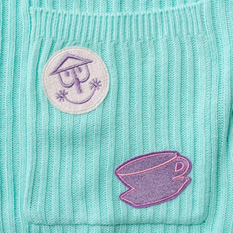 • 3 patches on pockets: a small world clock patch, a teacup patch, and a castle shield patch