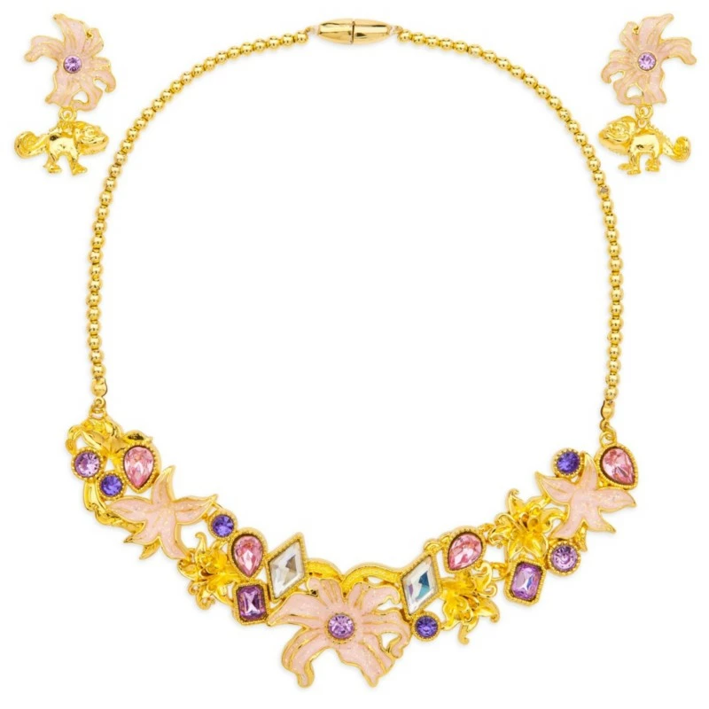 Lend a touch of sunshine to any Tangled costume with this breathtaking jewellery set designed to complement our Rapunzel costume collection. A golden necklace with floral filigree and faceted gems is matched by floral earrings with Pascal bobs.