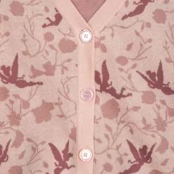 Imagine yourself in Never Land as Tinker Bell soars all around this cardigan. The allover intarsia knit pattern features the little fairy from Disney’s Peter Pan intertwined with a floral design and is complemented by three large pink buttons.
